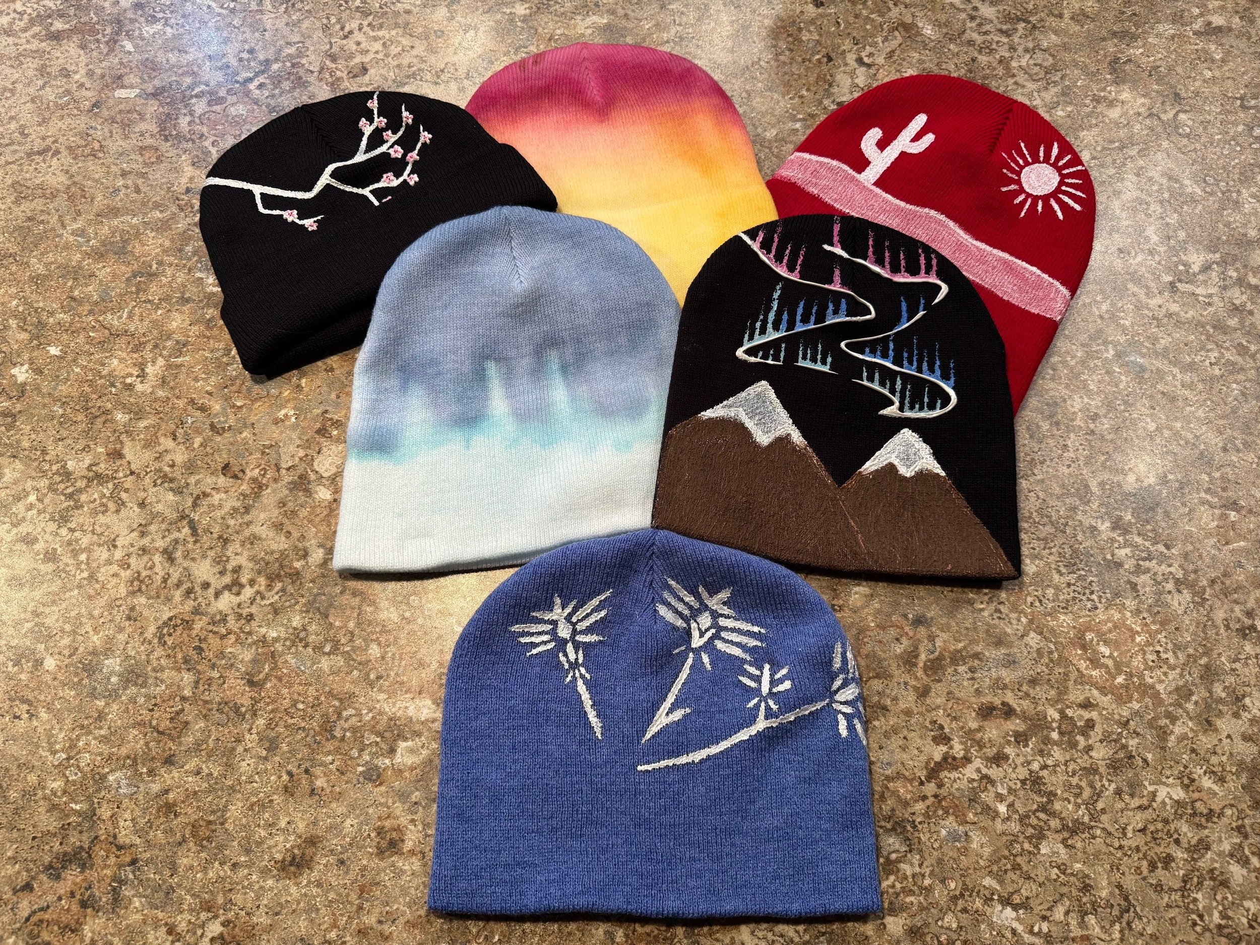Each beanie is made using hand painting and dyeing techniques, so no two pieces are exactly the same. We focus on organic colors, natural themes, and small details, creating pieces that feel calm, bold, and personal. Sola is about the feelings you get when you are in nature and making those feelings into something wearable.